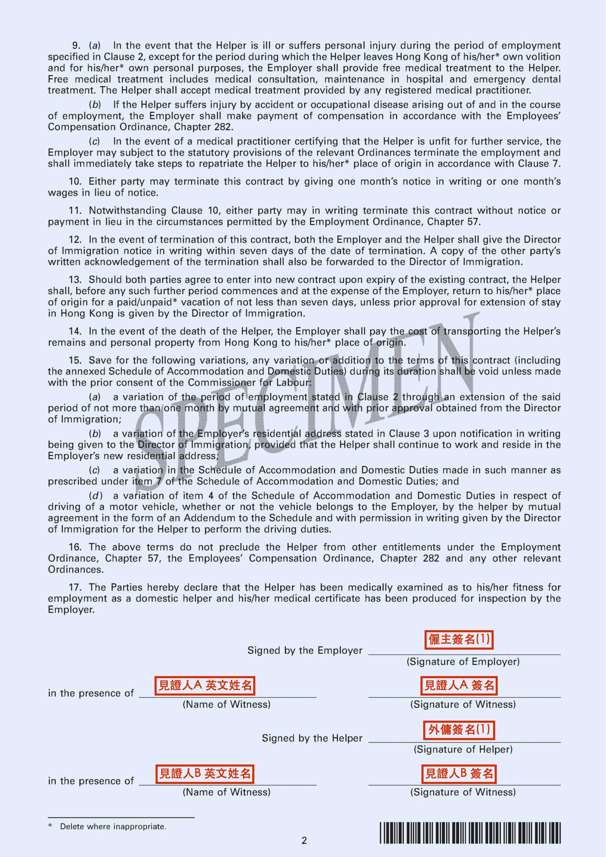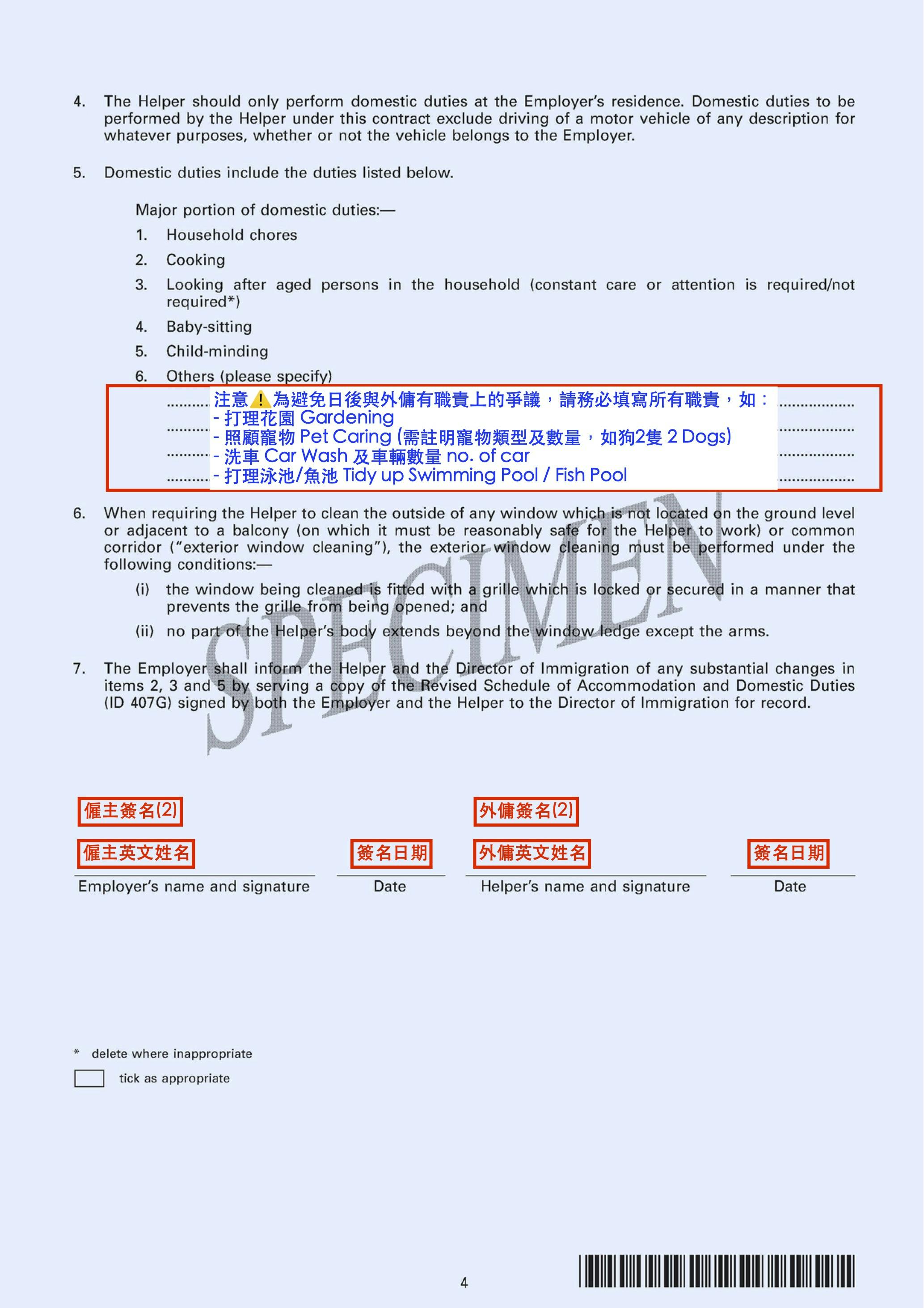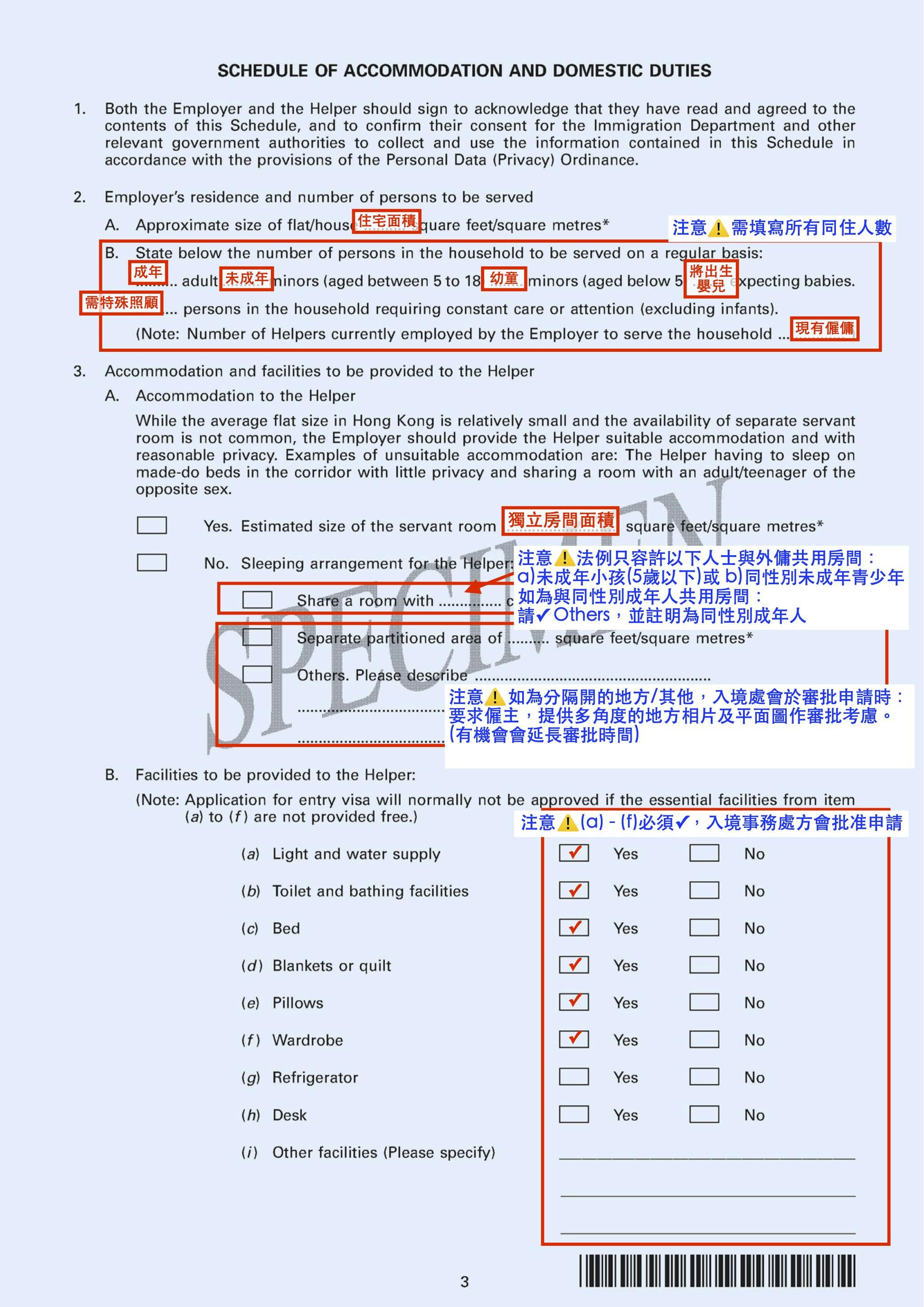 - 住宿安排: 必須註明傭工在該地址內具體的居住空間(例如:「獨立工人房」或「與小孩同房」)。根據規定,僱主必須提供「合適且具備合理私隱」的住宿地點。
